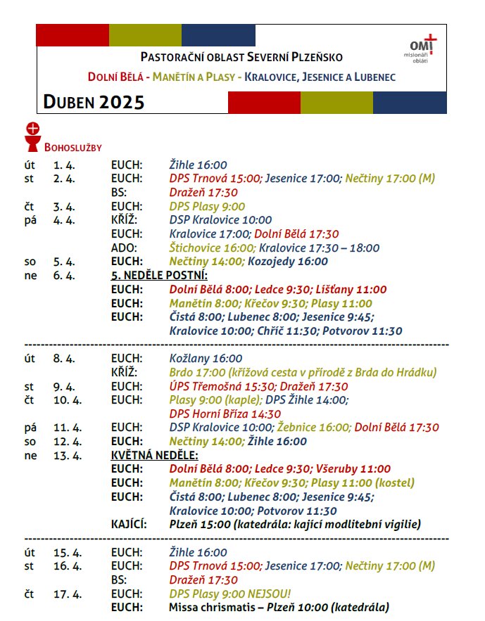 Rozpis bohoslužeb a událostí na duben